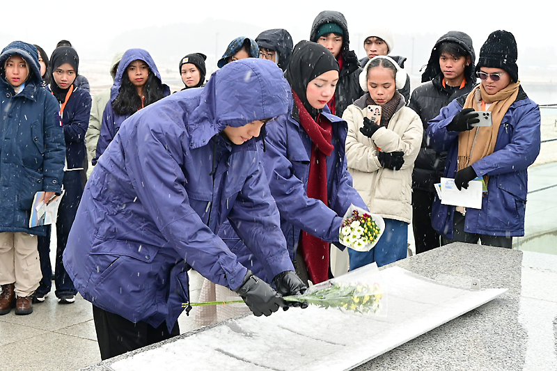 参加者らは、解説員の案内で東日本大震災津波伝承館を見学後、同公園内の「海を望む場」に移動。雪が降る中で代表のナショナル・リーダー2人が献花を行い、震災犠牲者らに黙とうをささげた。