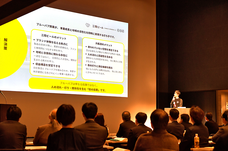 ビジネス部門では、三陸ブルーイング・カンパニー合同会社の南忠佑代表社員(48)が、同町のキャッセン大船渡内に先月オープンさせたタップルーム(飲食スペース)などへの思いを発信。醸造をはじめ今後の展開にも触れ、受賞後は「地元に愛されるブランドにするとともに、世界で賞を取るビールにしていきたい」と述べた。