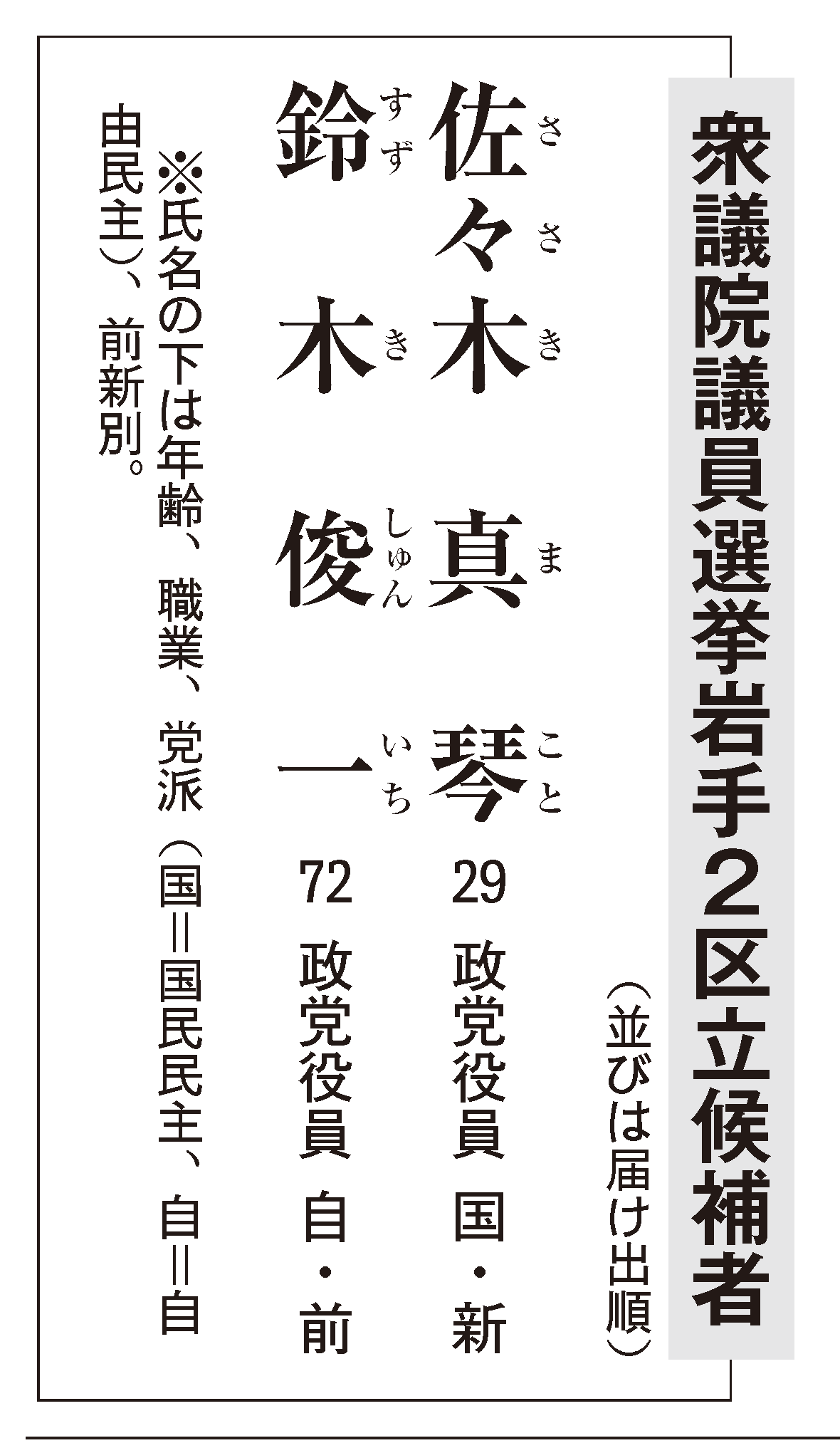宮古市議から転身して県内初の国民民主公認候補となった佐々木氏が、財務相や党幹事長など要職の経験と厚い地盤をもとに12期目を目指す鈴木氏に挑む。2区は与野党一騎打ちの形で12日間の選挙戦が繰り広げられる。