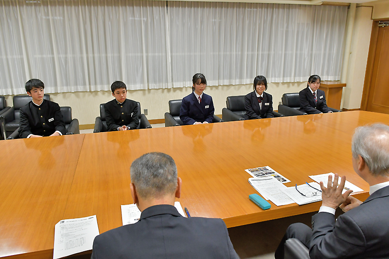 報告に訪れたのは、第一中の鈴木麻央さんと山本瑞季さん、大船渡中の菅野千佳さんと佐藤渉さん、東朋中の佐藤優真さんの5人。市側は渕上市長や藤枝修副市長、小松伸也教育長らが対応した。