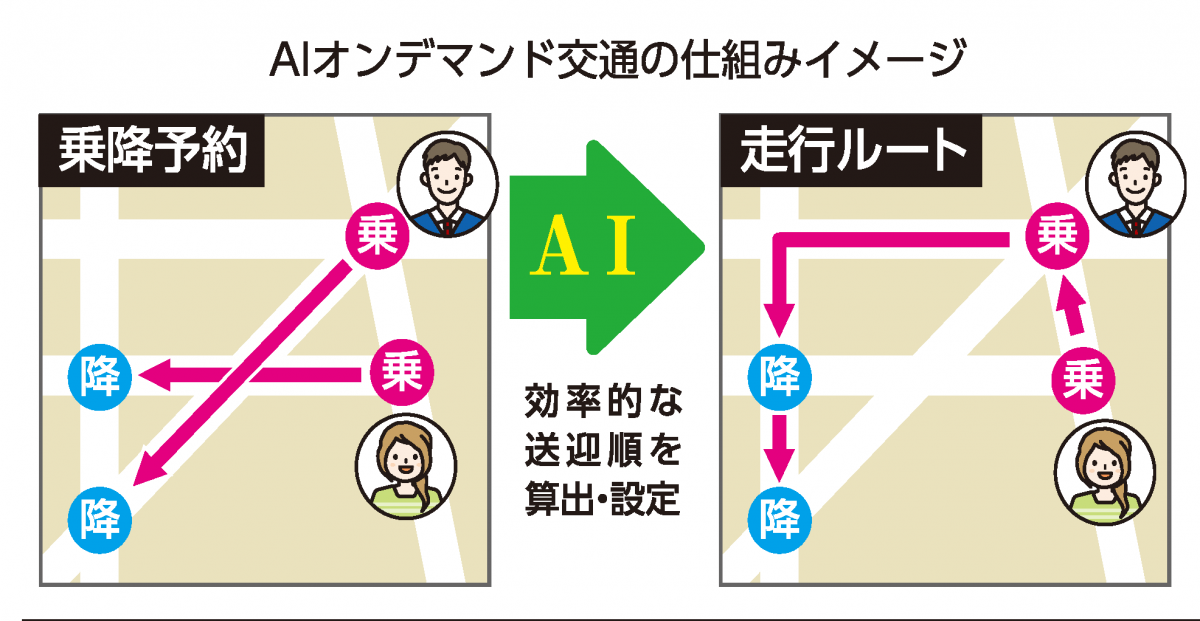 AIオンデマンド交通は、時刻表や決まった経路を設定せず、予約状況などに応じてAIが選んだ最適ルートを走るサービス。スマートフォンのアプリやコールセンターへの電話などで配車予約を受けて運行する。