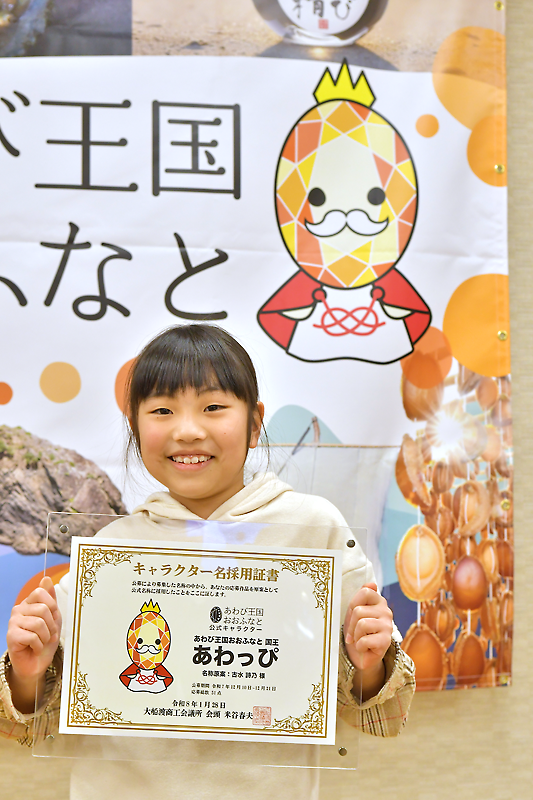 大船渡市の大船渡商工会議所(米谷春夫会頭)が、地域活性化プロジェクト・あわび王国おおふなとの取り組みで作成したキャラクターの名称が「あわっぴ」に決まった。公募で採用された越喜来小学校1年の古水詩乃さんには、採用証書と記念品を贈呈。関係者は、気仙沿岸で漁獲、加工されるエゾアワビを生かした取り組みのさらなる充実に期待を込めた。