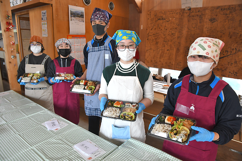 同日は予約制で生徒考案の弁当も販売。1年生が、陸前高田市のりくカフェの管理栄養士・菅野香澄さんから栄養や減塩などに関する講座を受けたうえでメニューを考案。本番では、町産食材もふんだんに使った「住田ふるさとヘルシー弁当」を1食700円で販売する。1月には生徒有志がりくカフェを訪れ、りくカフェスタッフの指導を受けながら試作に挑戦した。