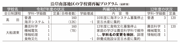 気仙では当初案で、入学者数の減少、水産科や調理師免許を持つ家庭科の教員確保の面などから、10年度に高田・海洋システムと大船渡東・食物文化を募集停止とする方向性を提示。海洋システムと食物文化の調理師養成施設機能は宮古水産に集約し、同科の家庭の学びは大船渡東・農芸科学で維持するとした。