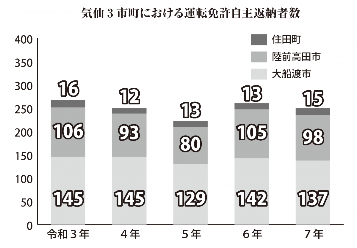 同署管内の自主返納者を市町別にみると、大船渡市が137人(前年比5人減)、陸前高田市が98人(同7人減)、住田町が15人(同2人増)。このうち、75歳以上は計192人(同6人減)で、全体の4分の3を占める。