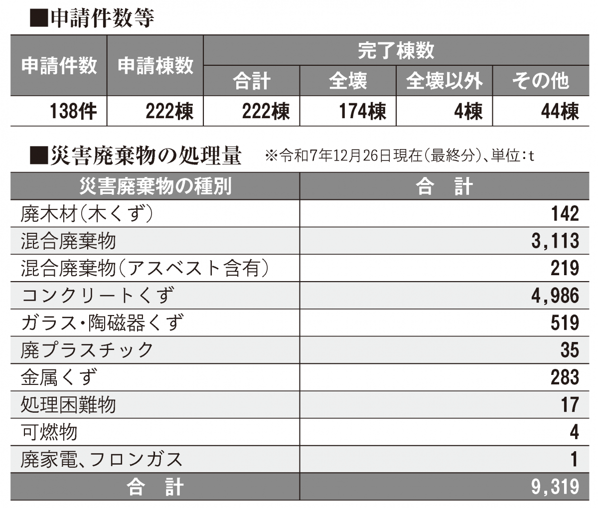 公費解体は所有者の希望に応じて行うもので、生活環境保全や二次災害の防止などが目的。全壊に関しては国の災害等廃棄物処理事業補助金を活用し、半壊家屋などに関しては市の独自支援策として進めてきた。申請件数や災害廃棄物の処理量は別掲の通り。