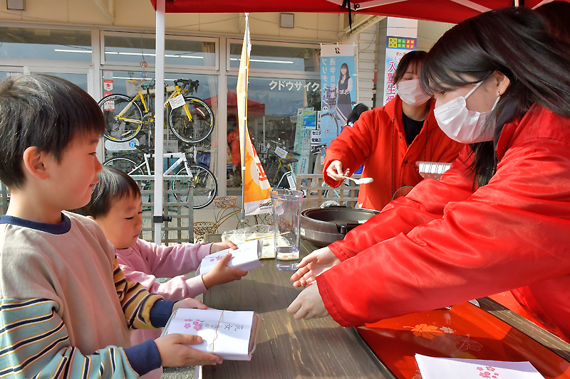 梅ケ枝餅で心温めて 夢商店街でお振る舞い 福岡県・筑紫女学園大生が今年も(別写真あり)