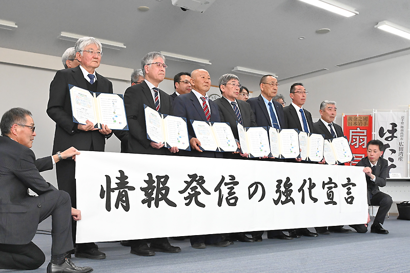 気仙の水産関係生産者団体や水産加工団体、魚市場、行政による「産地力向上協議会」は16日、大船渡市大船渡町の市魚市場で水産地の今を伝える「情報発信の強化宣言」を行った。参集した水産関係者らが、過去3回の会合で決定した取り組み内容を記した宣言文を朗読。主要魚種の不漁や自然環境の変化で苦境が続く中、関係機関が一丸となって全国各地に安心安全で高品質な水産物を提供するとともに、新たに開設したポータルサイトやSNSなどを通じて水産業に関わる情報を広く普及していくことを宣言した。(菅野弘大)