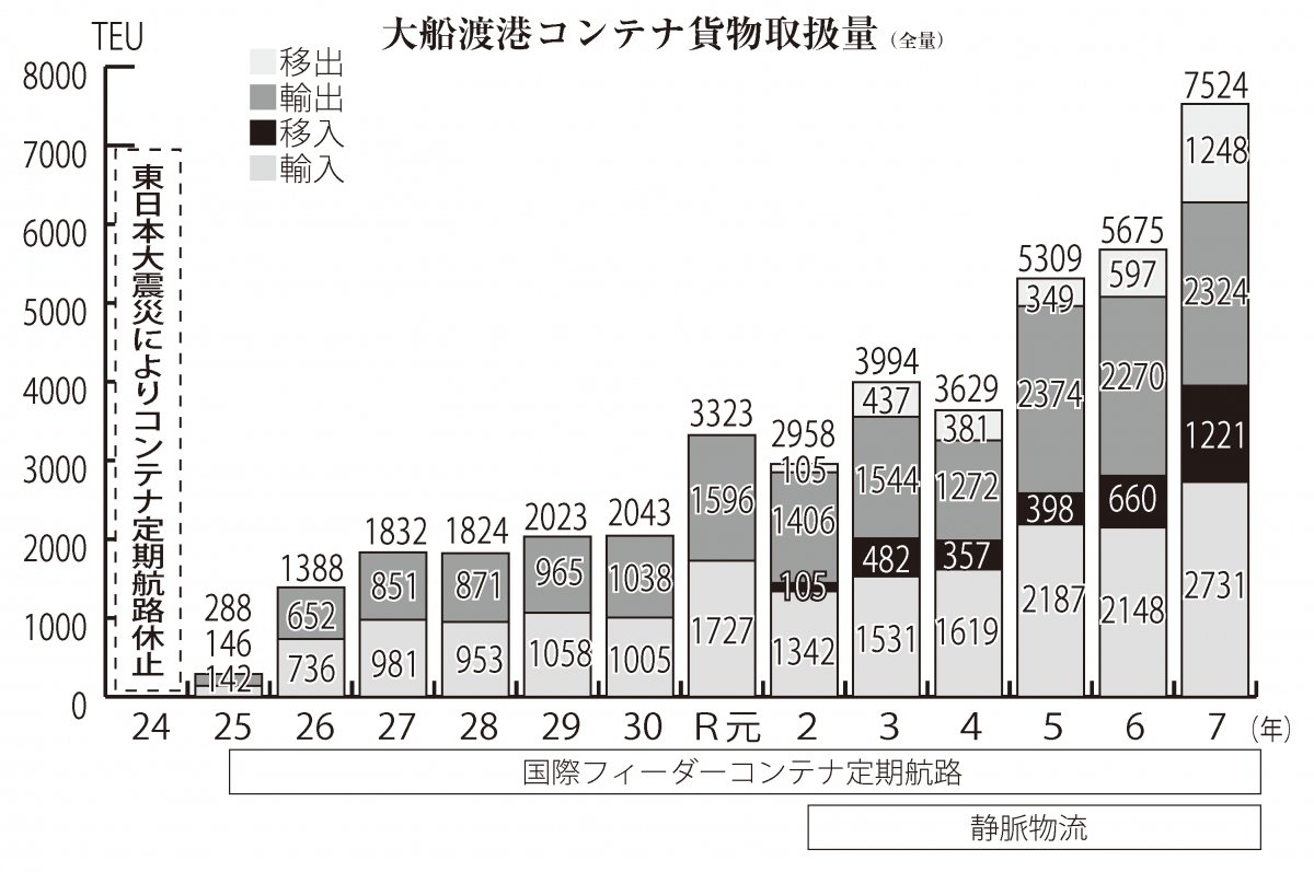 大船渡港は幹線道路から荷物を運びやすい地理的な要因に加え、気候面に左右されにくく、スケジュールが安定していることも好まれ、他港からのシフトも増えつつある。トラック運転手の時間外労働が規制強化される2024年問題への対応や、二酸化炭素排出量削減が叫ばれる中、陸上輸送から海上輸送への転換も追い風となっている。