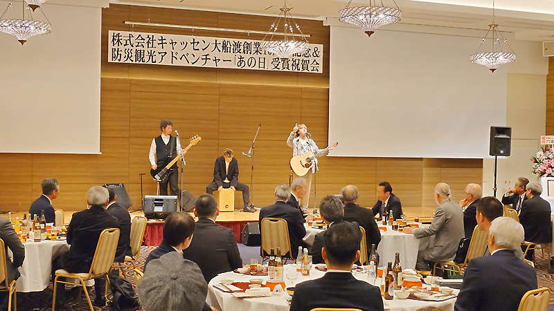 ㈱キャッセン大船渡(田村滿代表取締役)の創業10周年と、同社などが関わる防災観光アドベンチャー「あの日」の防災功労者内閣総理大臣表彰受賞などを記念する祝賀会が2月28日、大船渡市大船渡町の大船渡プラザホテルで開かれた。東日本大震災以降の復興まちづくり事業に携わる関係者が集い、キャッセン整備準備からの思い出を振り返るとともに、さらなる充実を誓い合った。