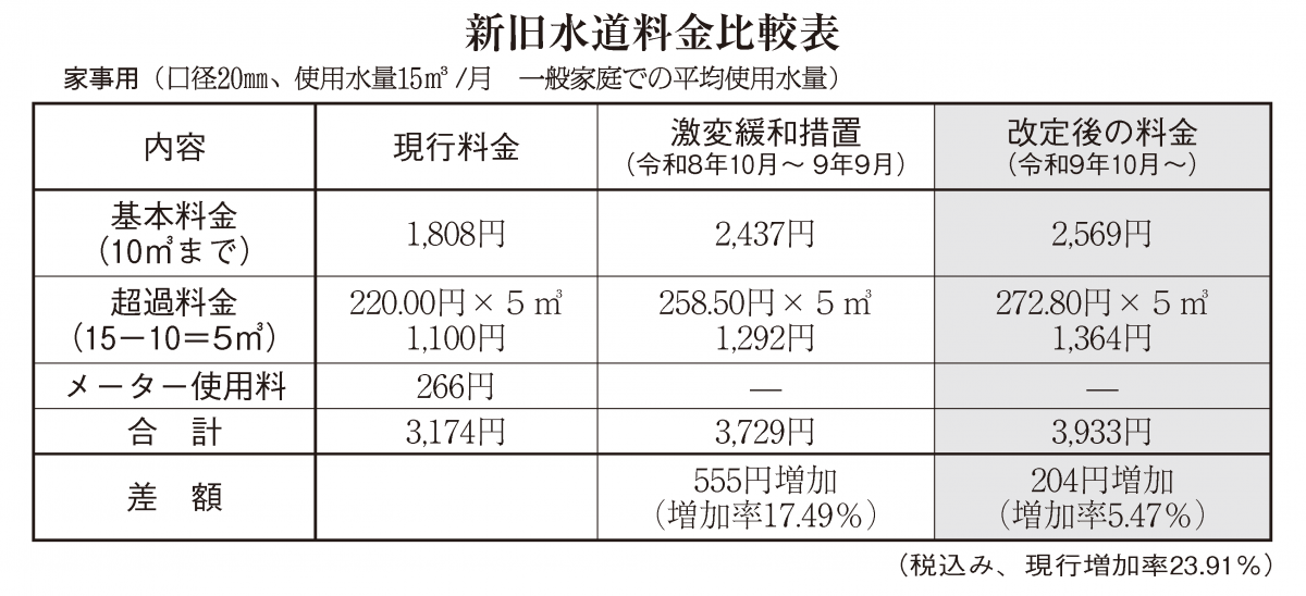 平均使用水量をもとにした一般家庭での家事用(口径20㍉、月使用水量15立方㍍)の料金改定は別掲の通り。段階的な引き上げを経た改定後の料金増加率は23・91%で、年間負担は9108円の増となる。