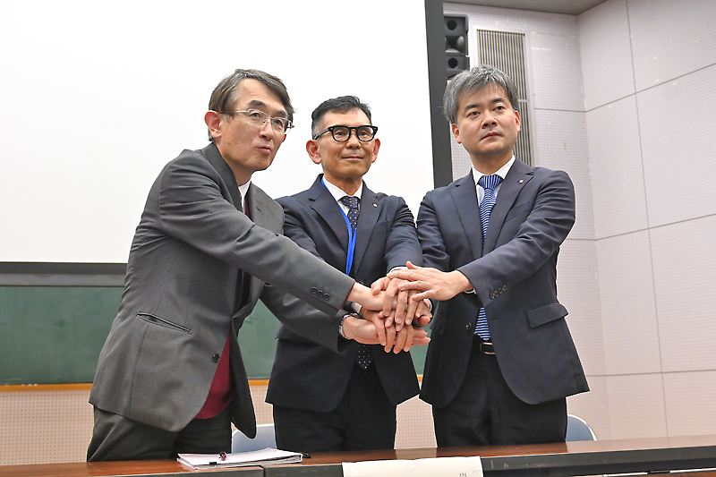 同日は、県水産技術センターで連携協定締結式が開かれ、同社の佐藤陽一取締役・原料事業部長、同学部の天野勝文学部長、同センターの太田克彦所長のほか、関係者らが出席。3人が協定書に署名を行ったあと、佐藤取締役が研究内容を説明し、産学官が連携した取り組みに期待を込めた。