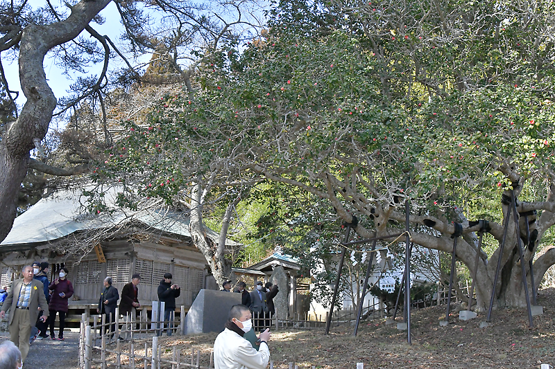 中森熊野神社では、大きな枝張りを保ち続ける推定樹齢1400年の三面椿に感嘆の声が上がった。前回の大船渡大会以降、平成14年の台風21号では主幹2本が折れ、樹形のほぼ半分を損失。15年前の東日本大震災では浸水被害を免れ、幾多の津波を乗り越えてきた地域の誇りや、不屈の精神の象徴として存在感が高まった。