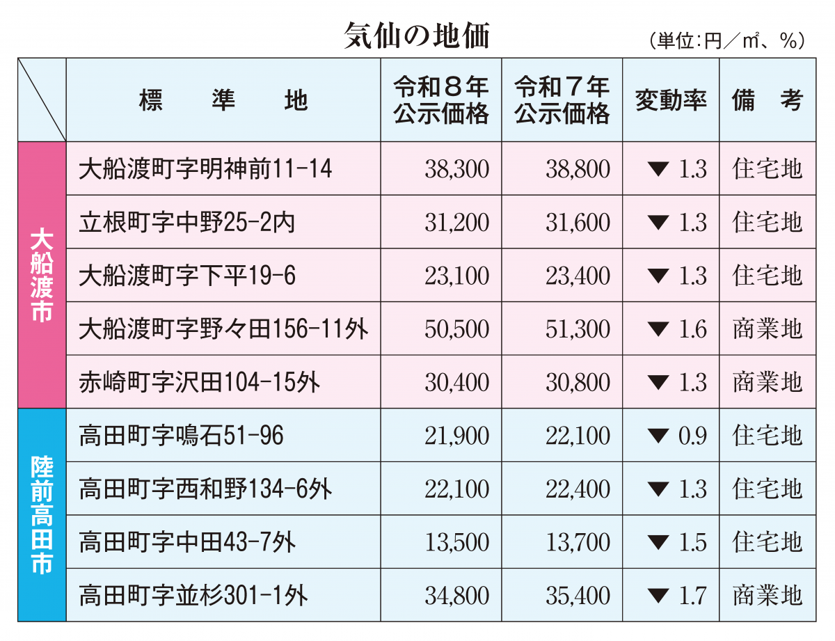 気仙両市 6年連続の下落 全用途の平均価格と変動率 令和8年の公示地価発表 人口減や建築費の高騰で