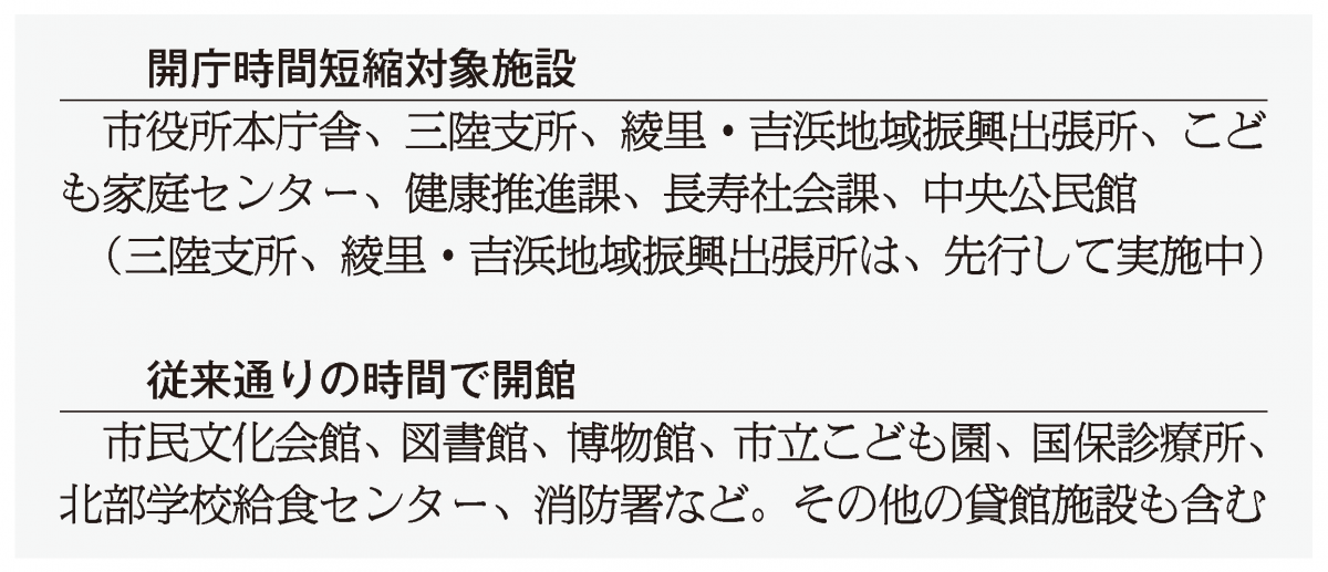 市は今年に入り、本庁の一部窓口(市民環境課、国保医療課、税務課)で実施している月曜日と金曜日の窓口対応時間を午後6時30分までから同5時15分までに改めているほか、三陸支所と綾里、吉浜の両地域振興出張所の窓口対応時間は午前9時~午後4時とし、午前11時30分~午後0時30分には休止時間を設けている。今月までは試行期間としているが、4月以降も継続する。