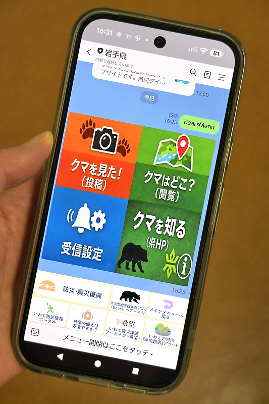 県公式アカウントを友だち追加し、「防災・震災復興」メニューからベアーズボタンを選択すると、▽クマを見た!(投稿)▽クマはどこ?(閲覧)▽受信設定▽クマを知る(県ホームページ)──の四つのボタンが表示される。
