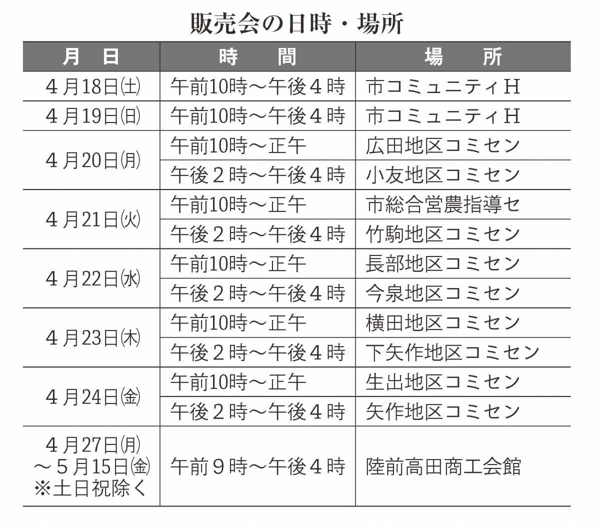 販売会の会場は市コミュニティホールや各地区コミュニティセンター、米崎町の市総合営農指導センターで、1日につき1、2カ所で開催する。同月27日(月)から5月15日(金)までは高田町の陸前高田商工会館で販売する(土・日曜日、祝日を除く)。