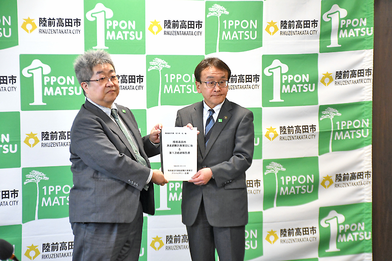 報告書の手交式が3月30日、市役所で行われ、有識者でつくる市津波避難計画策定アドバイザリー会議の牛山素行委員長(静岡大防災総合センター教授)をはじめとする全5人の委員、佐々木拓市長らが出席。牛山委員長が佐々木市長に報告書を手渡し、概要を説明した。