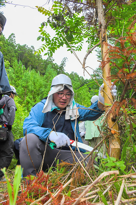 7年度は各企業・団体が延べ17回、約330人が参加し、市有林の下刈りや枝打ちなどを実施。森林作業だけでなく、水産業の現場視察や震災学習など同市ならではの体験プログラムが組まれ、交流人口増、企業と地域との継続的な関係性構築につながっている。