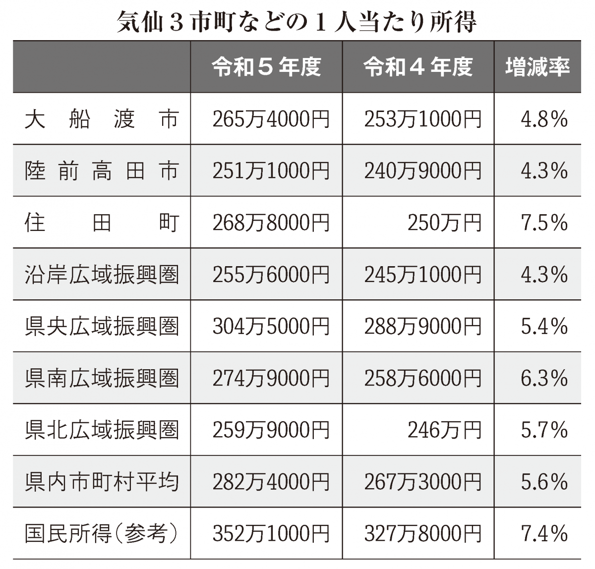 5年度の1人当たり所得のうち、市町村平均は前年度から5・6%増加した。広域振興圏別にみると金額が多い順に、県央304万5000円(前年度比5・4%増)、県南274万9000円(同6・3%増)、県北259万9000円(同5・7%増)、気仙を含む沿岸は255万6000円(同4・3%増)となった。