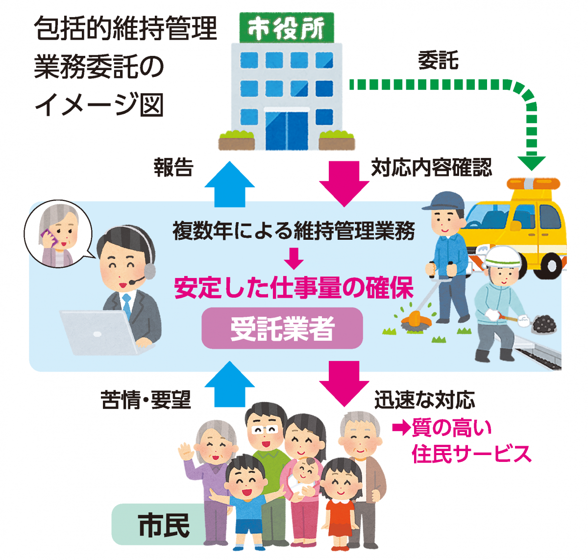 従来は、市が作業内容ごとに事業者に単年度で委託していたが、包括的民間委託は複数年契約で一括して実施するため、事業者側にとって安定した仕事量の確保につながる。民間がじかに通報を受けることで、早期着手も期待される。