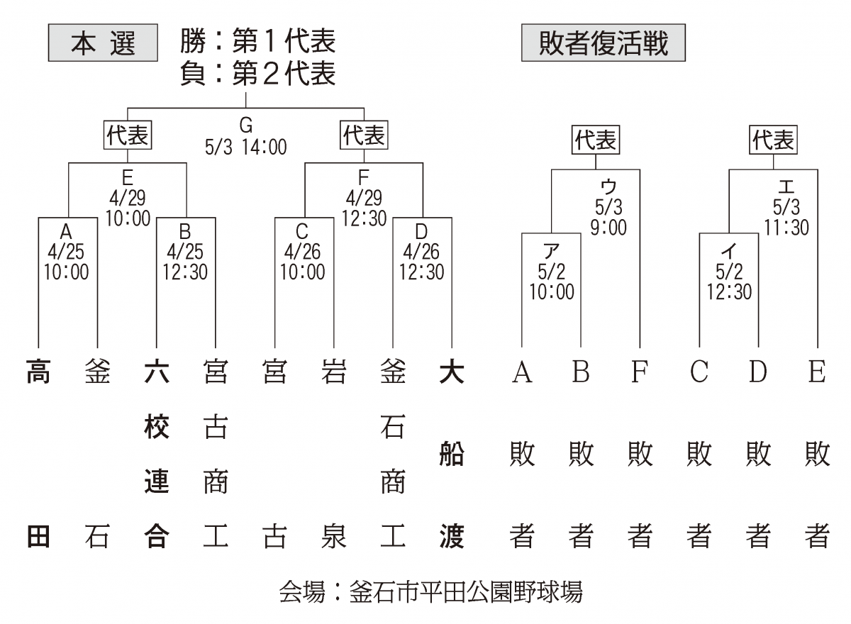 県大会は、5月15日(金)~20日(水)の第1週と同23日(土)、24日(日)の第2週に分けて開催。第1週は陸前高田市の楽天イーグルス奇跡の一本松球場(高田松原運動公園第一野球場)、盛岡市のきたぎんボールパークでトーナメントの準々決勝までの20試合を行い、第2週は奇跡の一本松球場で準決勝、決勝、3位決定戦の4試合を実施する。