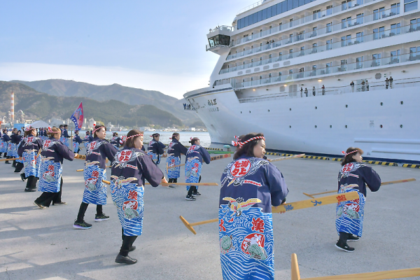 歓迎セレモニーでは、渕上清市長が「待ちに待った初寄港。お迎えできることを光栄に思う。大規模林野火災の復興に向け、力強い後押しになる。乗船客の皆さんが、豊かな自然や海の幸に触れ、忘れられない素晴らしい思い出になることを願う」とあいさつ。
