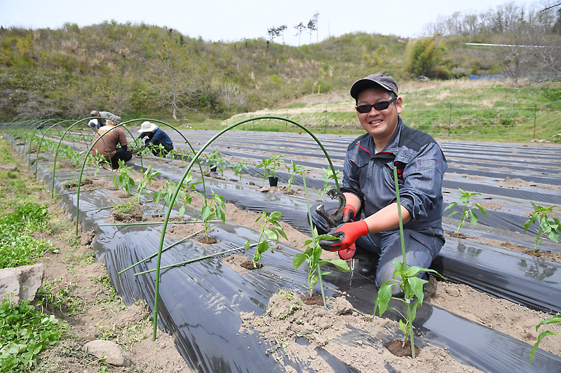 今年は、ピーマンの作付面積を前年の30㌃から50㌃に拡大。苗の定植数は前年比約2倍の最大8000株、収穫量は25㌧以上を目標に定めた。作付面積、定植数ともに、気仙3市町のピーマン圃場では最大・最多の規模になるという。