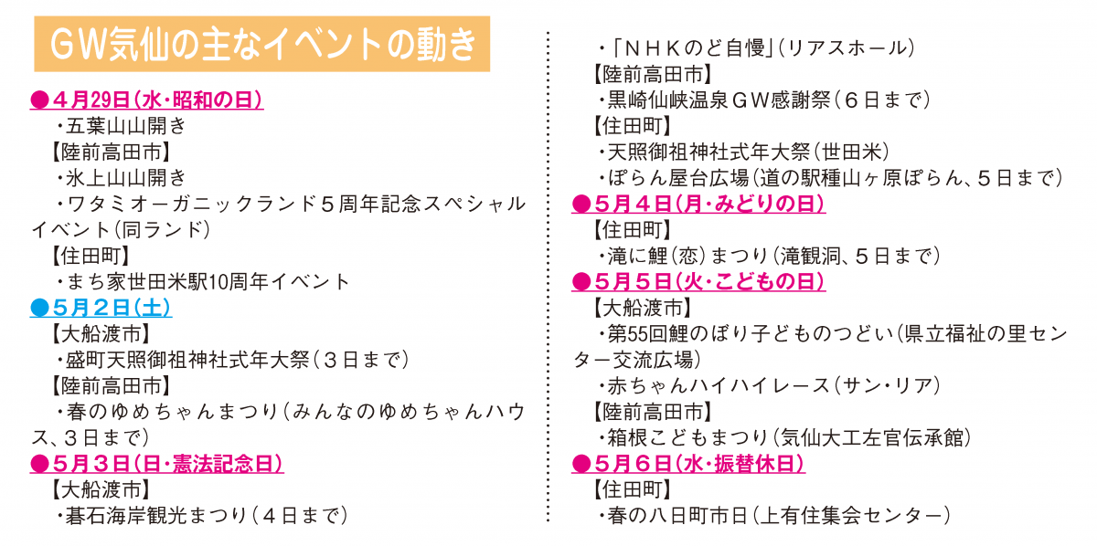 物価高騰や中東情勢に伴う燃油価格の上昇などの影響が懸念される一方、各地のイベントは帰省客や地域住民による近隣レジャーの受け皿になることも期待される。各地の商業施設でも、GWに合わせて特別イベントを用意。気仙3市町ではプレミアム商品券の販売が行われ、休日を生かした地域住民による消費拡大も期待される。