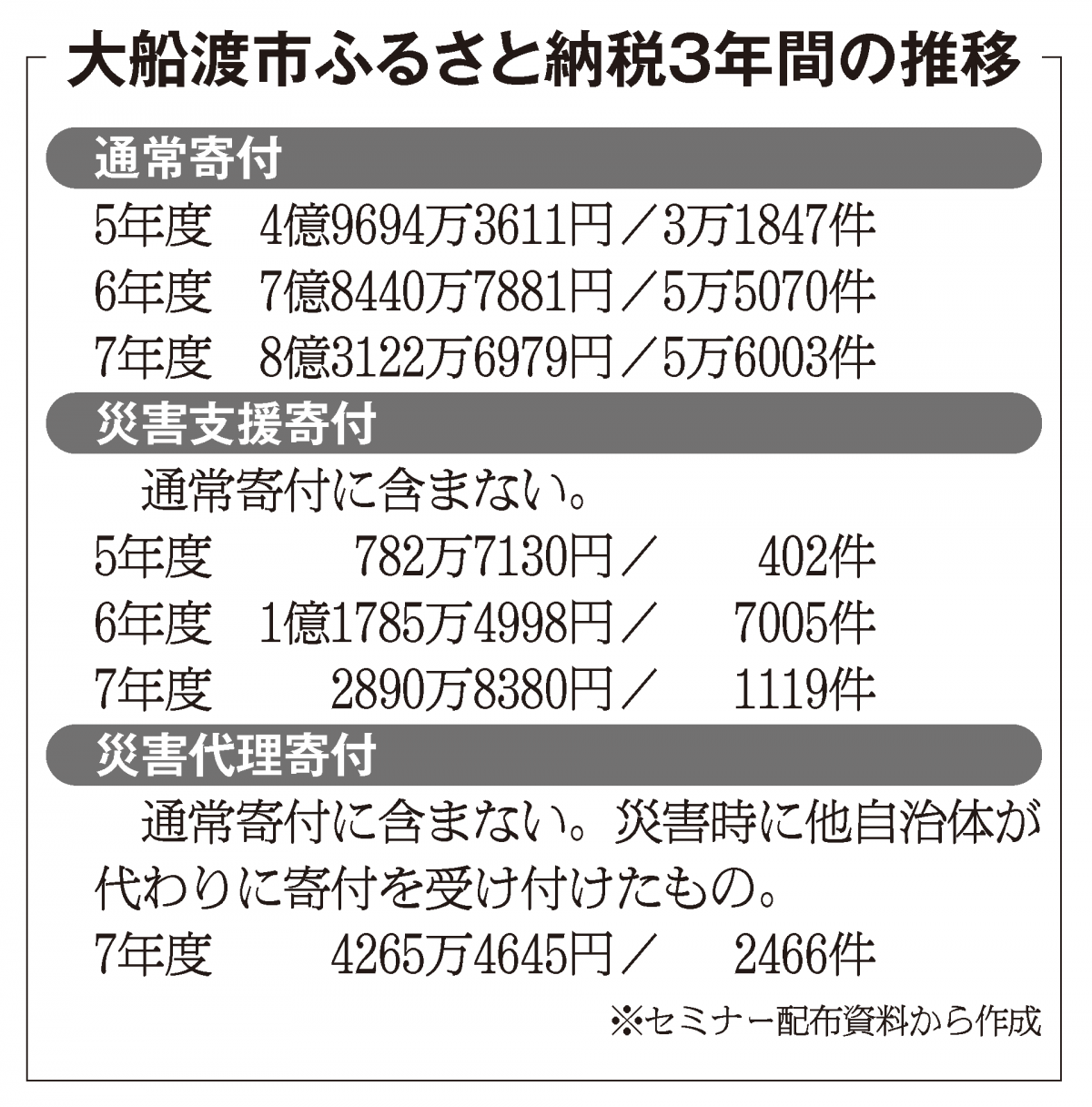 ふるさと納税の前年度実績は、大船渡商工会議所が24日に開催した「大船渡市ふるさと納税掲載事業者対策セミナー」で示された。商議所では5年度から、物価高騰などの影響を受け、苦境に立つ事業者への支援事業として、ふるさと納税業務を受託しているパンクチュアル㈱(高知県須崎市)や大船渡市と連携している。