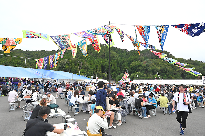 会場となる岸壁を大漁旗で彩り、サンマの焼き台をずらりと並べて「さんま焼き師」が香ばしく焼き上げる。生サンマに加え、ワカメやホヤ、ウニなどの水産品販売に加え、カキやホタテの炭火焼きや各飲食出店業者による品々も充実させる。